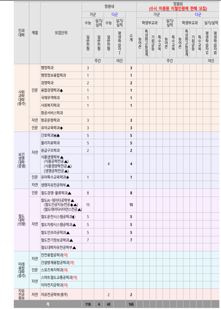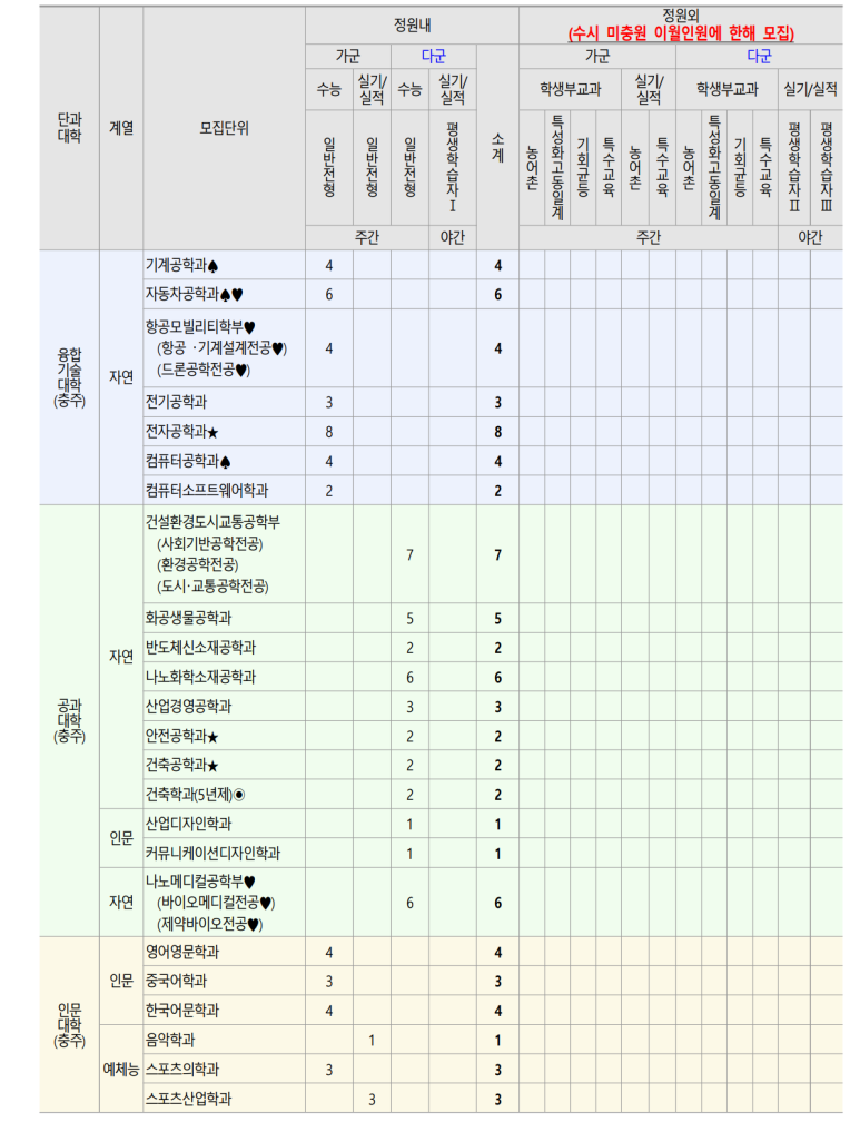 - 수험 생활 후기 및 조언: 학교를 고려하실 때 기존의 생활권도 고려해보시길 바랍니다. 수도권에 있다가 충주라는 낯선 지역에 와서 다소 적응에 어려움을 겪었습니다. 학교명과 학과에 메리트가 있다고 판단해 지원했으나, 저와는 적성이 맞지 않아 재수를 할 생각입니다.