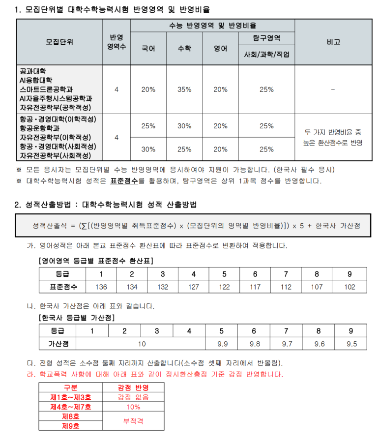 - 수험 생활 후기 및 조언: 재수했습니다. 국어 극상비로 이공계열 반영비 무시하고 붙었습니다. 항대라인 대학은 자신의 강점 과목은 높게 유지하고 약점 과목을 하한선 밑으로 안내려가게 하는 것이 중요한 것 같습니다. 26학번은 탐구 한 과목 반영으로 알고 있는데, 이러한 경향이 더 두드러지지 않을까 싶습니다. N수생들은 모의고사 등급에 일희일비 하지 마세요. 자만이든 낙담이든 생각 자체를 많이 하지 않고 관성적으로 공부하는 사람이 결국 이기는 것 같습니다. 꾸준히 약점을 보완하고, 9모 이후로는 체력 싸움이니 푹 자고 컨디션 관리 잘하길. 화이팅입니다!